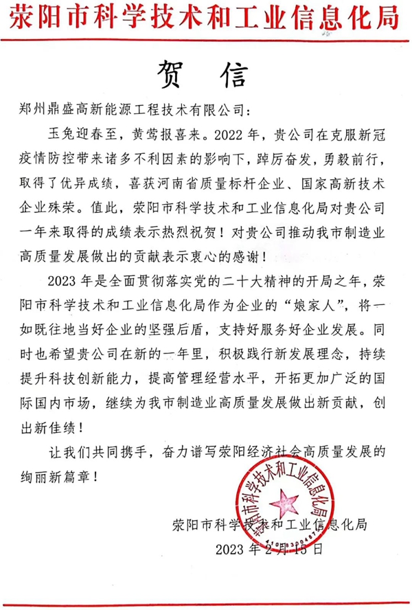 2月15日,荥阳市科学技术和工业信息化局向郑州古天乐太阳集团城入口高新能源工程技术有限公司(以下简称“郑州古天乐太阳集团城入口”)发来贺信。向公司过去一年取得优异成绩表示祝贺,恭贺郑州古天乐太阳集团城入口喜获河南省质量标杆企业、国家高新技术企业等殊荣。对郑州古天乐太阳集团城入口推动荥阳市制造业高质量发展做出的贡献表示感谢。