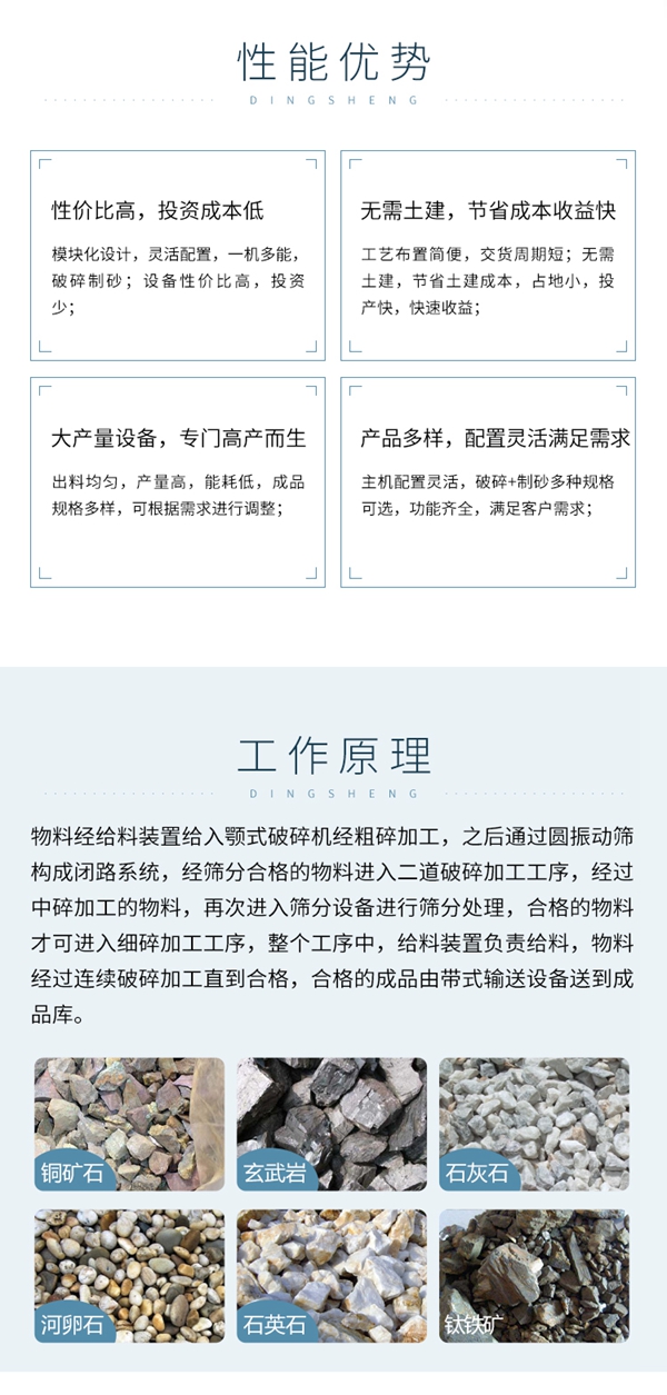 与传统固定式生产线的安装方式相比,撬装式模块化设备减少占地,减少土建成本,现场安装工作量少、安装周期短,可快速投产,具有性价比高、模块化设计、无需土建、配置灵活等显著优势,广泛应用于花岗岩、河卵石、石灰石等各种矿石破碎,建筑垃圾再生利用,铁路,高速公路,能源,水泥,化工,建筑等行业。